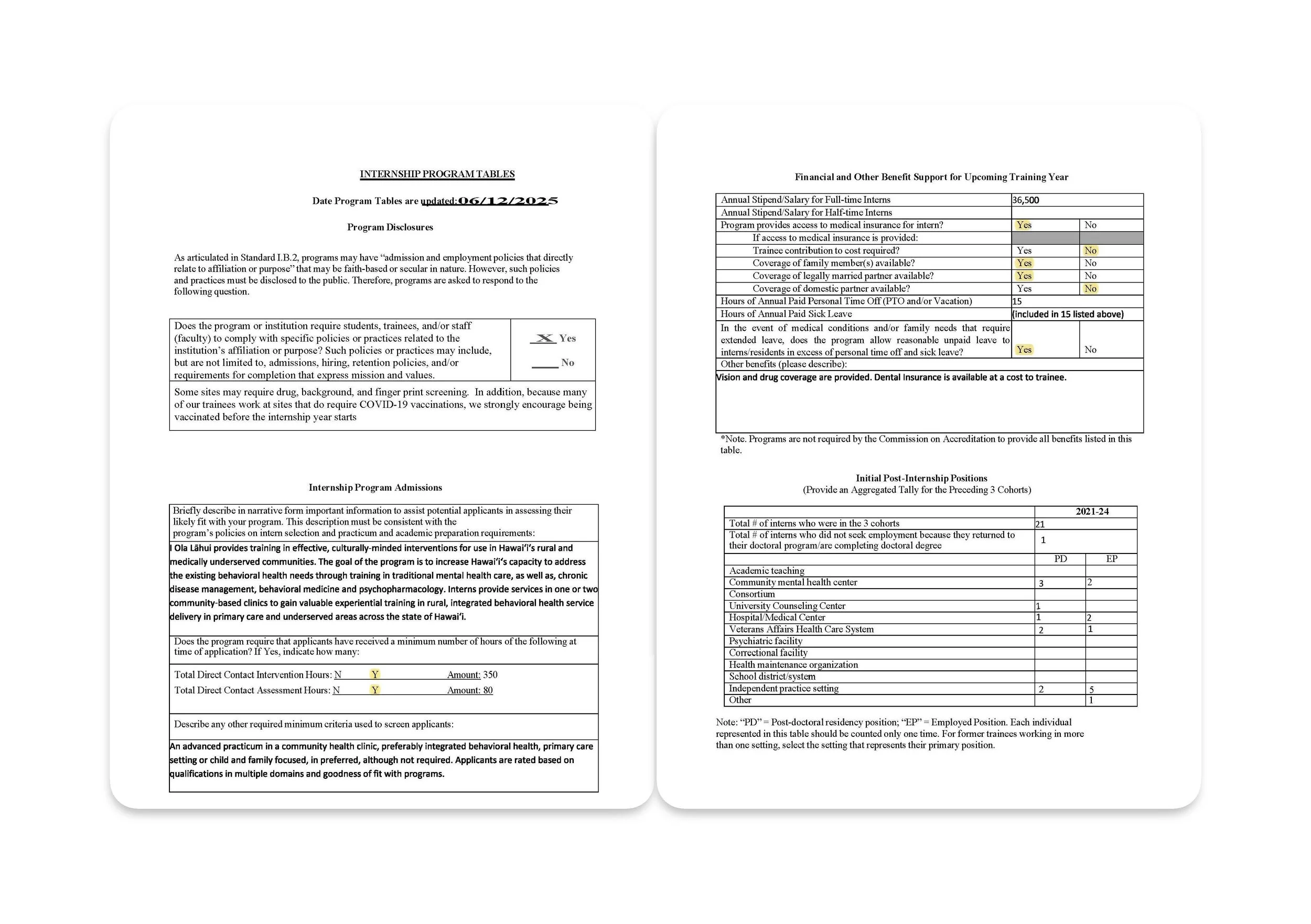 For the 2026-2027 year we will be accepting 6 full-time psychology interns, with a preference for those applicants who have stated an interest in I Ola Lāhui or service provision in a rural or Native Hawaiian community. Practicum hours are reviewed to ensure that the minimum requirements are met (350 intervention hours; 80 assessment hours). Applicants with community experience, diversity experience, or health psychology/primary care experience are preferred. Lastly we are looking for applicants who have experience with Cognitive-Behavioral therapy and completion of advanced practicum and Master’s degree in Clinical Psychology preferred. Given the significant increase in applications, applicants from APA-accredited graduate programs are are required.